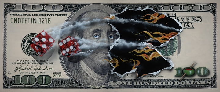 You may wonder where the snake eyes are since the dice show five and six…. Did you notice Benjamin Franklin’s eyes? This piece features a $100 bill with dice smoking through a burning hole and an olive in the 100 at the bottom right.