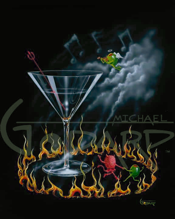 This piece has religious theme making it a perfect companion to 7 Heavenly Chards, Last Martini, and He Devil, She Devil series. “Dancing with the Devil” has a male olive dancing with the devilish Strawberry in burning ring of fire. The Strawberry has red mini skirt and high heel boots with the devil horns and devil tail. The angelic Olive watches from above to see if Olive will sell his soul to the Devil.