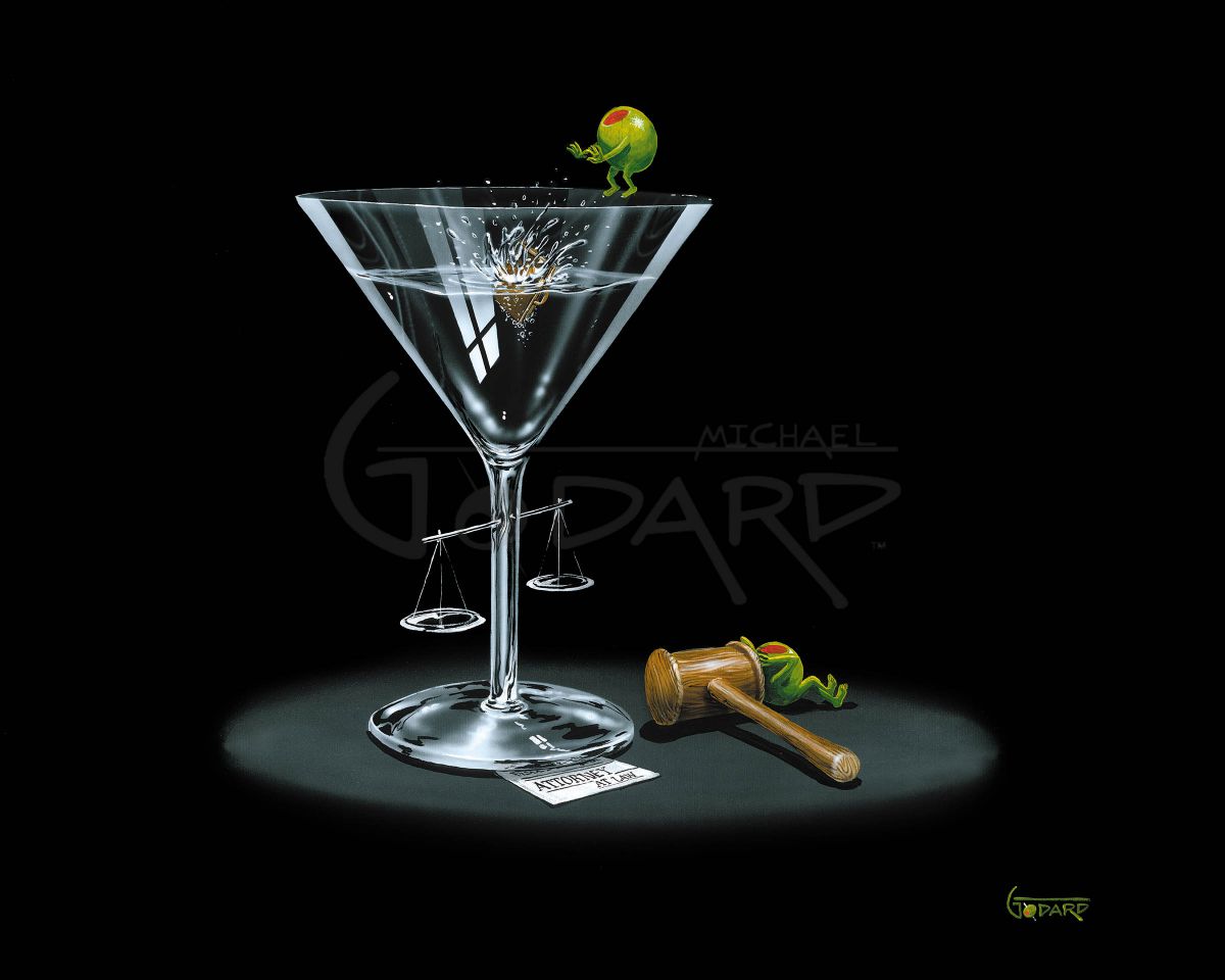 This image is a great attorney piece. On the rim of the glass, we see the olive that has lost the case tossing his briefcase into the martini out of frustration. The victor olive is kicked back behind the gavel. The scale of justice is blown into the stem if the glass.