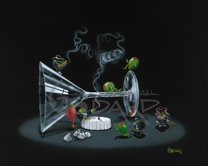 This is the second piece in my Gangster series. “The Boss” is sitting at the table and out of his cigar smoke emerges a bullet. The strawberry is standing next to the boss as eye candy. One olive is on top of the glass as the enforcer with a bat, one olive is praying for his life, and one olive is tied down prepared for the worst. Focus attention to the other side of the piece to a rat, which have all the wronged olives!