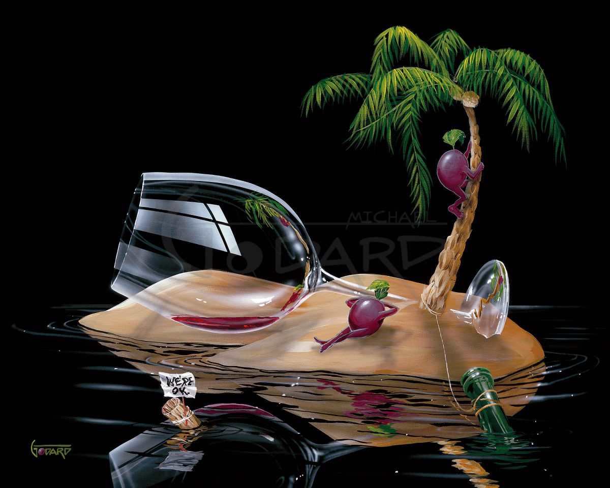 Grapes need a break every once in a while, so I created a paradise for them. They are lying on a deserted beach underneath palm tree and they have floated out a cork-carried message reading, “We’re OK”! With a bottle of red wine and a great beach with no stress or any hassles, these grapes have no need of rescue!