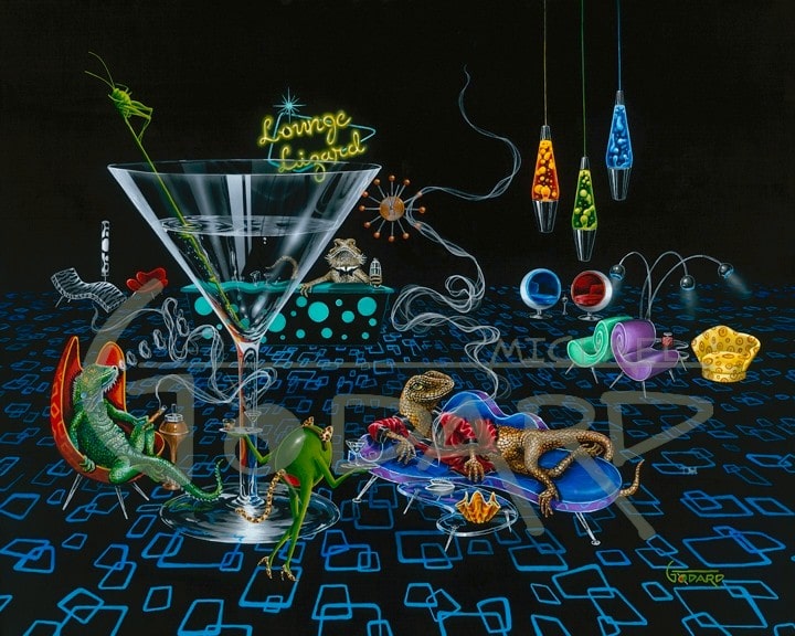 This is an awesome retro piece. The chairs, lava lamps the feel of the piece make you want to be in the 70;s again. The realism of the lizards is awesome. The stir stick is grasshopper, a lizard’s favorite snack. Check out his old bartender he has grey whiskers. Also the cocktail waitress is the world famous MISS. KITTY