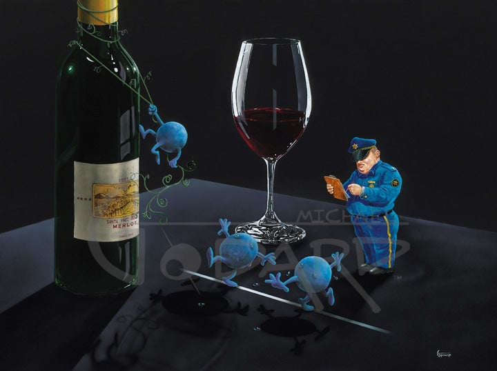 This was the fourth in the alcohol series and it first sold for $800. I couldn’t believe it sold for that amount back then. While doing this piece I was trying to find out how I wanted to do things. This shows a cop who has eaten too many donuts forcing two grapes to walk the line.