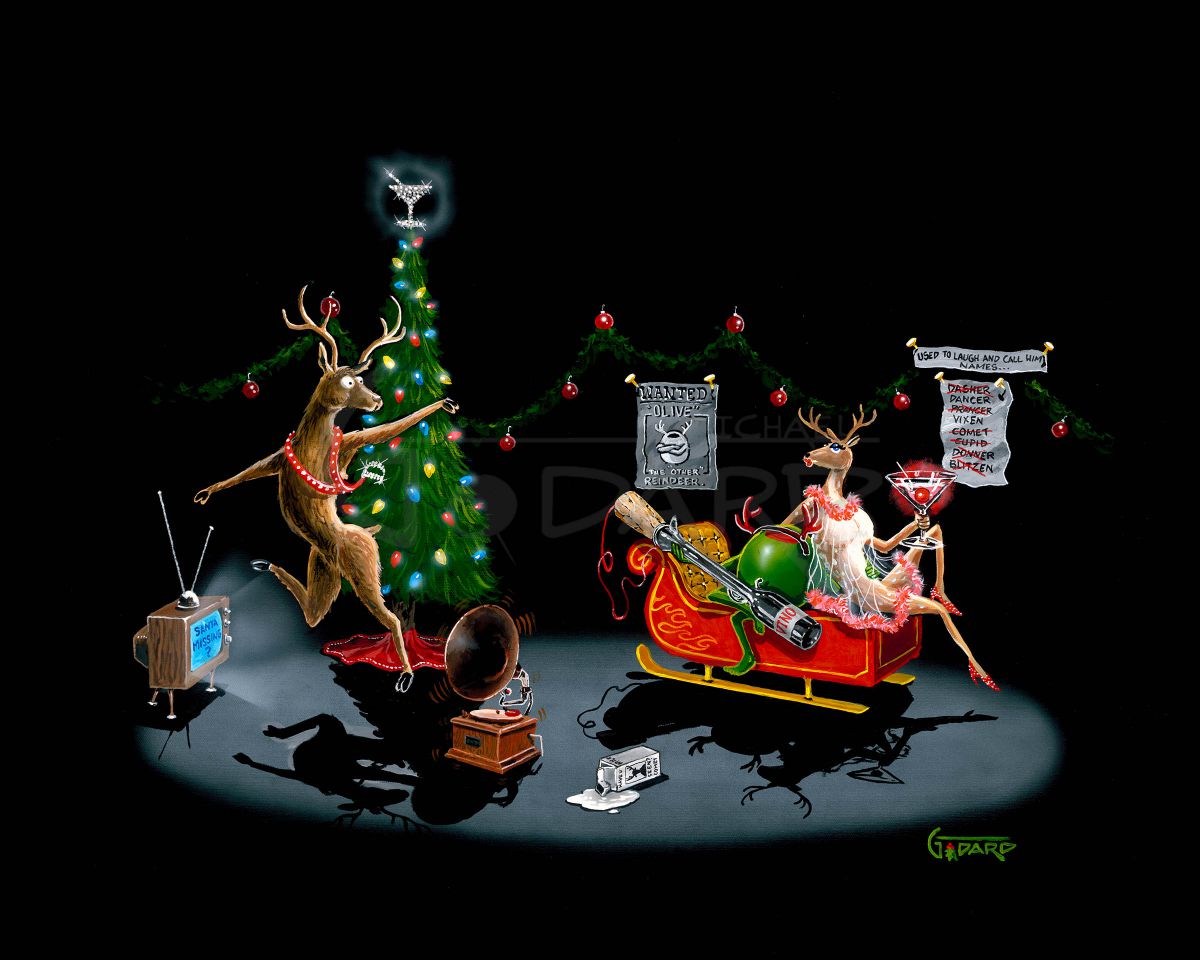 A sign on the wall says they used to laugh and call him names. All the names are crossed off of the list except Vixen and Dancer. Vixen is still there because she is a vixen. She’s lying across Olive’s lap. She has a nice build and is wearing a see-through negligee. Notice Rudolph’s nose glowing brightly in her drink. Dancer is dancing while Olive threatens to “bust a cork” in him with his “vino” gun.